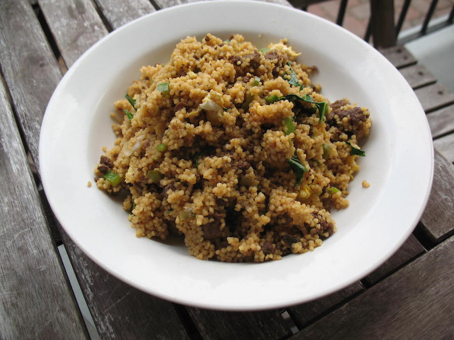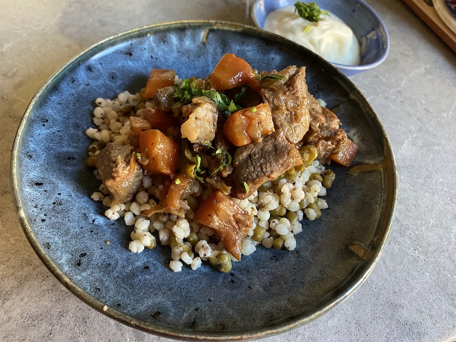 I started exploring sorghum with a sort of pilaf preparation, together with mung beans, inspired by the delightful 2019 cookbook by Gyulshat Esenova Sachak: Traditional Turkmen Recipes in a Modern Kitchen. In the cookbook this dish was called an etli köje (“porridge with meat”), but the grains are boiled and cooked through, just shy of bursting. The grains have an aftertaste with just a hint of bitterness and the accompanying sauteed lamb and carrots and gatyk yogurt were a perfect match.