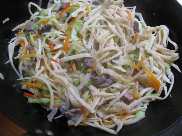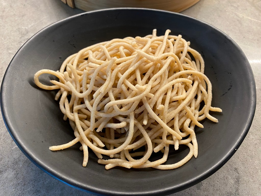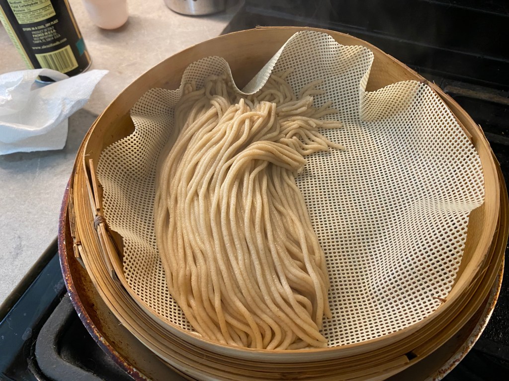 In all experiments with steaming, I had to let the noodles cool down before very gently breaking them up. Sticking was a bit of a problem, and perhaps there is further experimentation to be done with adding oil at some point to help noodles not stick together. Once noodles were cooled and separated, they could easily be mixed with a hot topping.