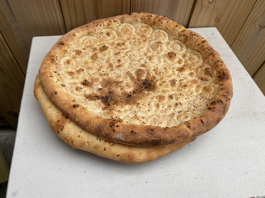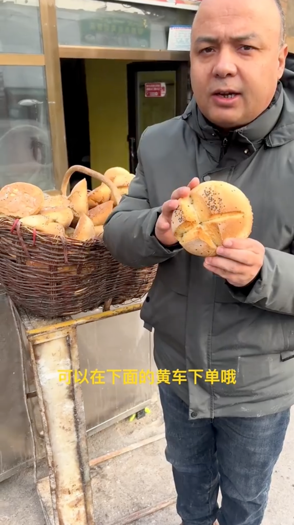 In regions that grow the grain, sorghum flour is often blended together with wheat flour to make sorghum bread. The image on the left is an example of that, a still image taken from one of the many WeChat videos posted on the account of Tayan读书会, a Turpan-area content creator. His videos often show many steps involved in producing breads such as these, what he calls “blended naan” or qoshuqluq nan قوشۇقلۇق نان.