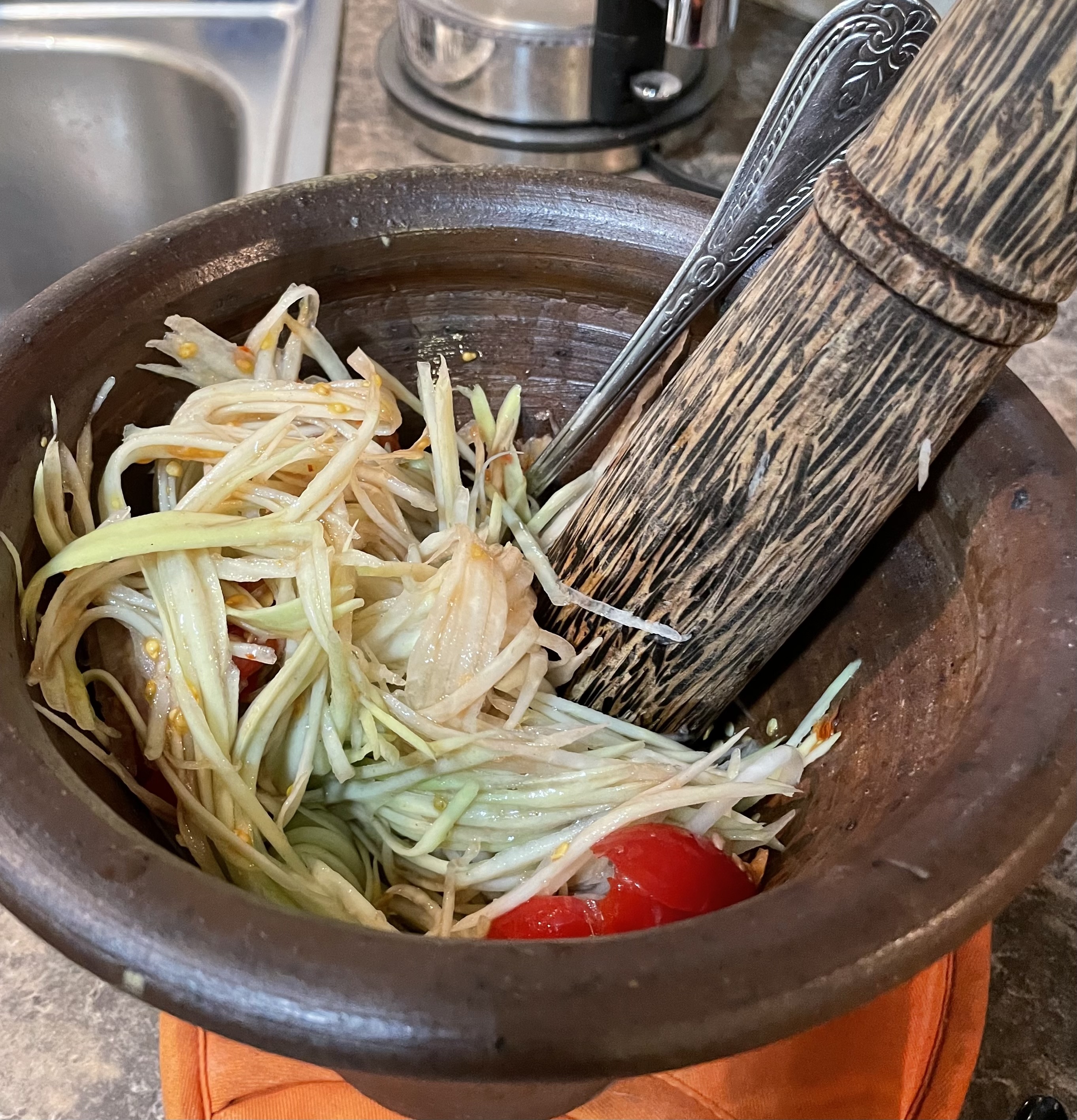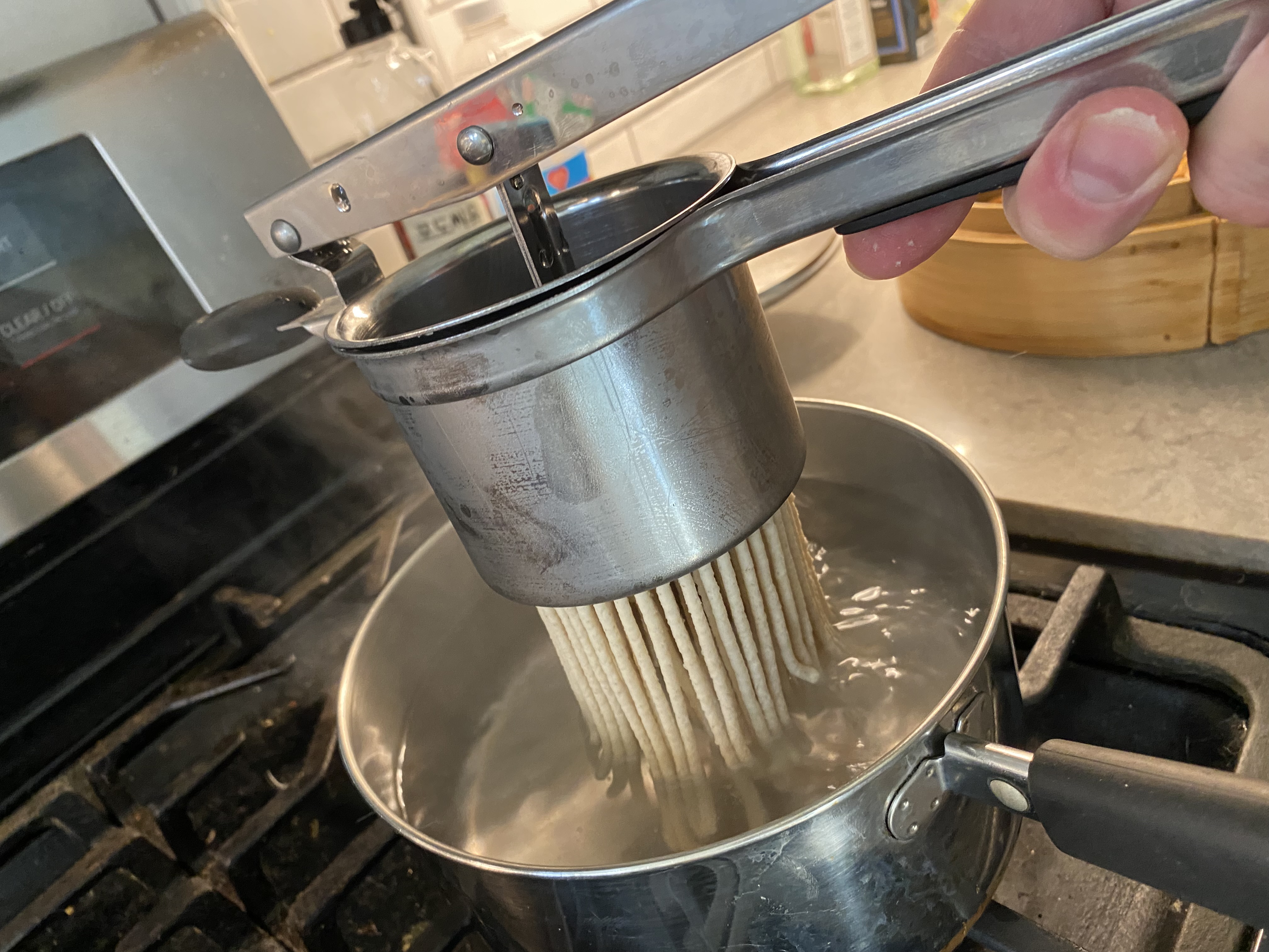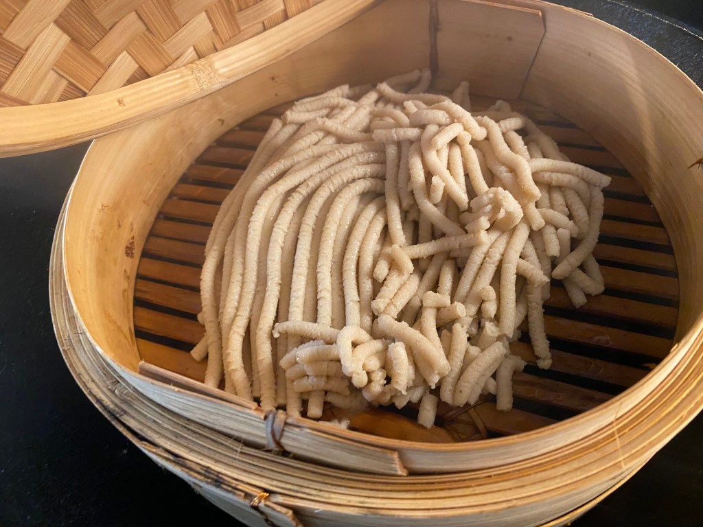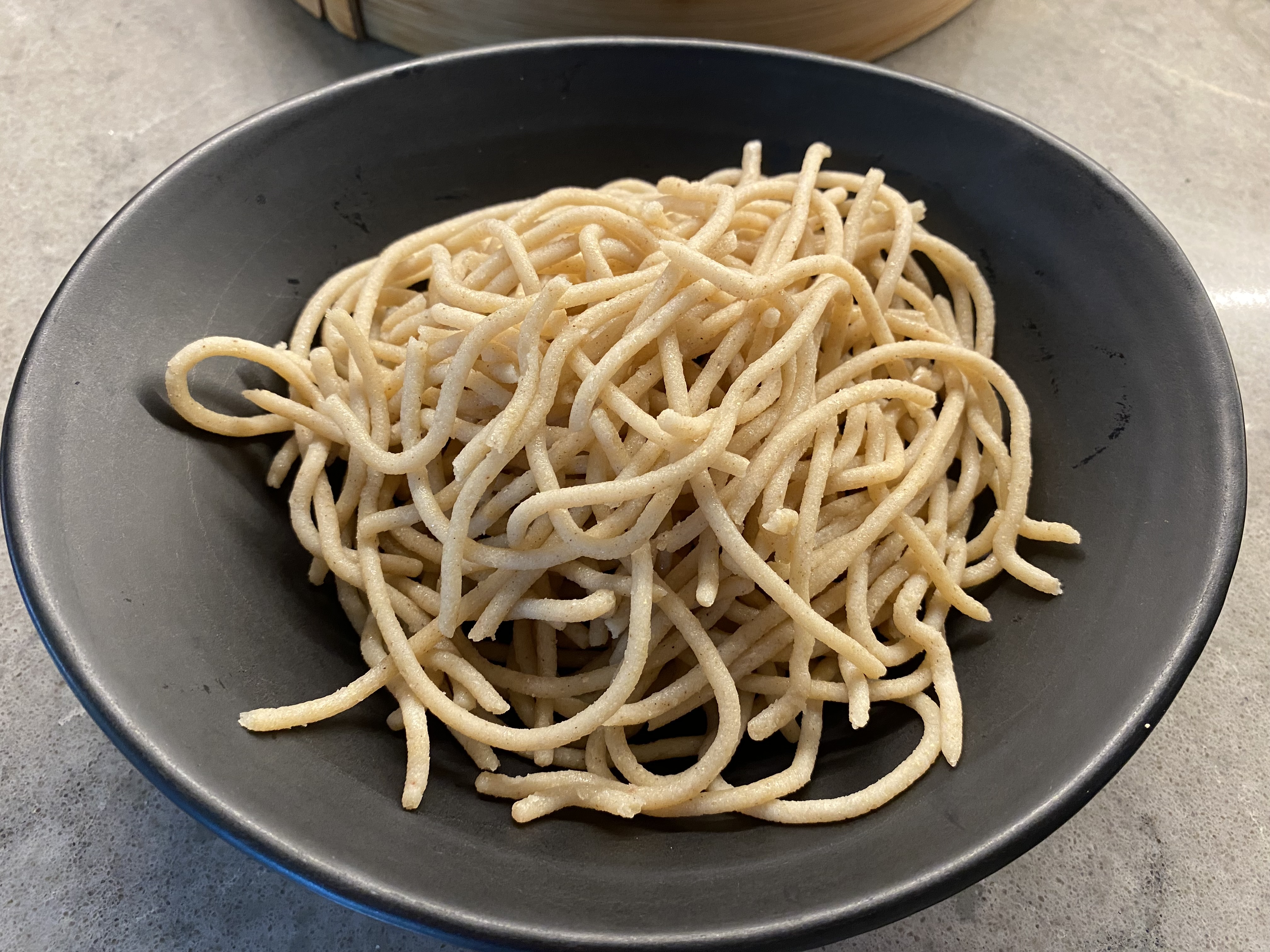 After studying those videos I then tried to extrude noodles into a steamer basket and steam for 20 minutes, like the Indian vloggers were doing. That ended up working much better, but only for the fatter noodles. The finer 100% sorghum noodles were still too crumbly.