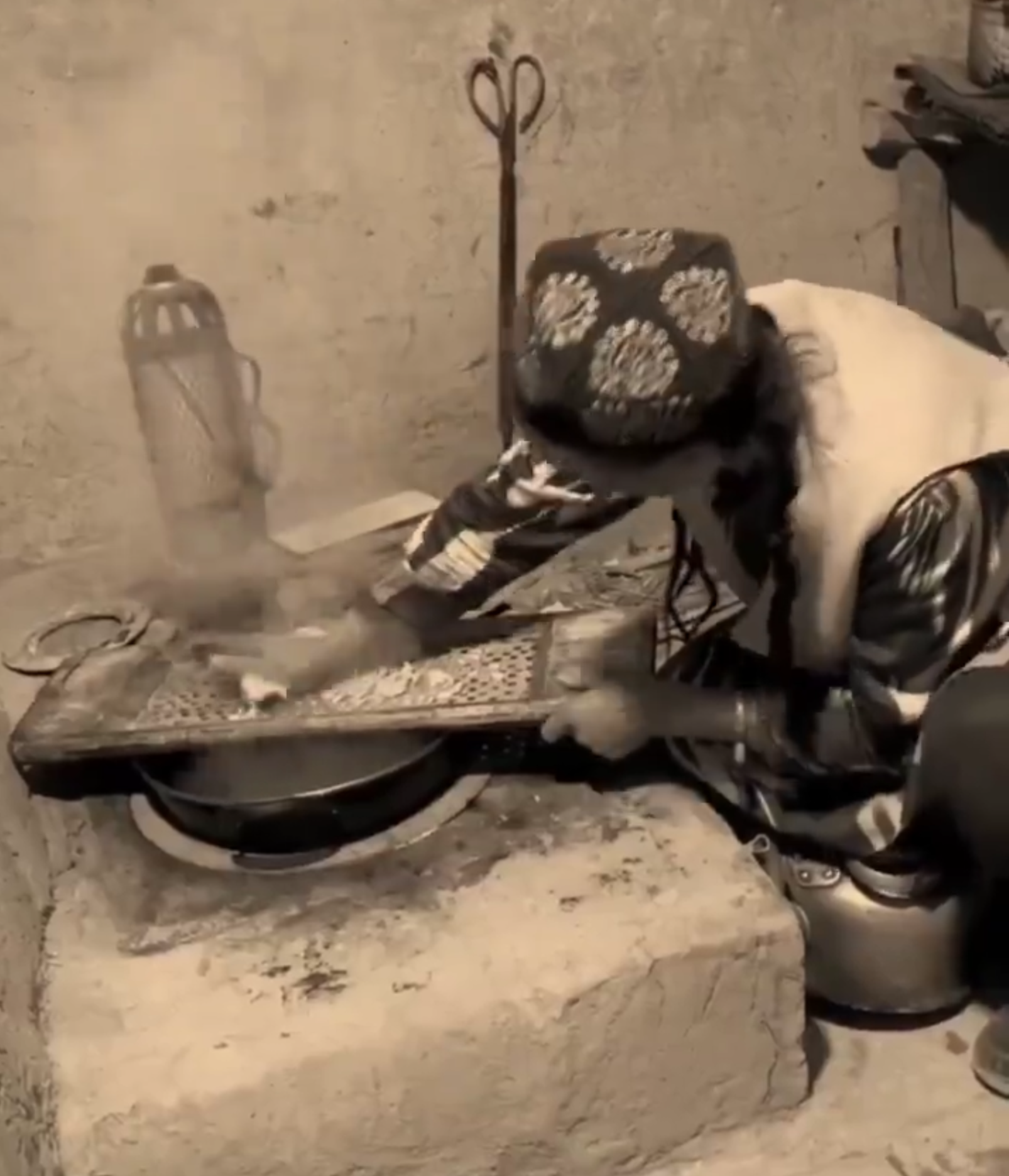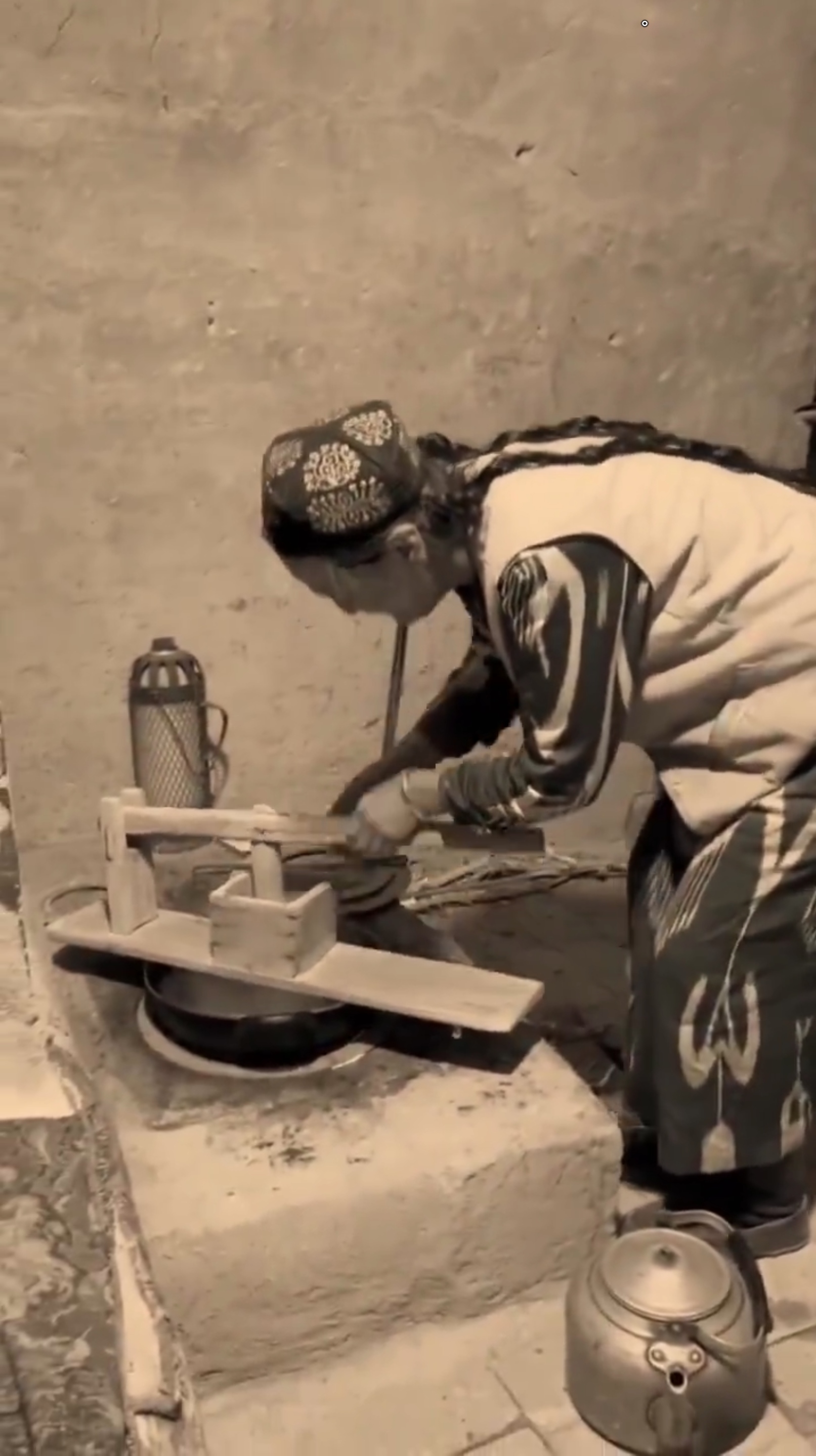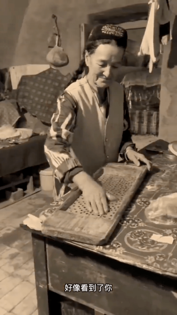 Recently a friend sent me a social media music video by “Kariz Äpändi” 坎儿井先生, a Turpan-area WeChat content creator that featured nostalgia of a difficult bygone era where elders made a style of extruded noodle that was called tüshük pän läghmän تۈشۈك پەن لەغمەن. In the video the singer finds his grandmother’s noodle board and noodle press and memories flood back to him depicting her pressing large noodles above a qazan of boiling water. After draining the noodles and dressing them she takes them to her husband who is toiling in the field, where there is also a baby in a cradle (possibly the singer?). Although it wasn’t strictly highlighted in the video, this type of extruded noodle was commonly done with sorghum flour, mixed with a little wheat flour. A friend from the Turpan region confirmed this was common up through to the 1990s or so, when wheat was still expensive for many in the villages around Turpan. The following are image stills taken from the music video posted in WeChat on Dec. 2nd, 2023: