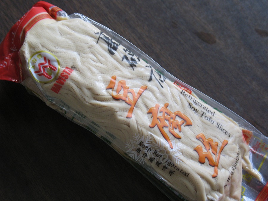 I found tofu threads in the refrigerated section of Spring Garden market. There was a variety of sizes. I bought this smaller bag for around $2. There are different kinds, some are infused with flavors. I accidentally bought this kind. This is the “5 spice” version. The spices are very mild, though, and it didn’t affect my recipe.