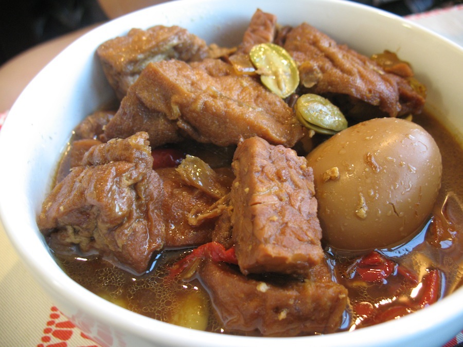 “TAHU TEMPE PETE TELUR”. $5. Basically a sweet five spice stew with eggs and Tahu tempe. Also notice those huge stink beans (pete in Indonesian, satau สะตอ in Thai)