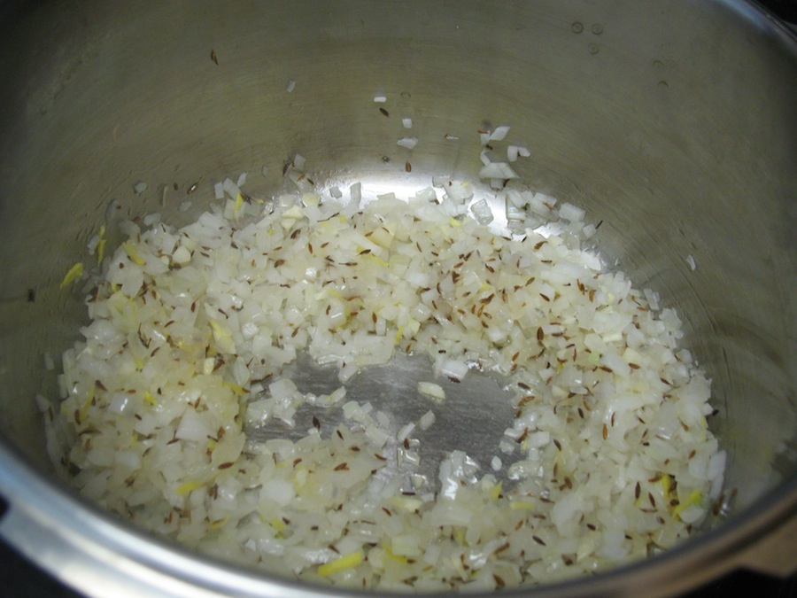 2. finely chop an onion. Put the oil and or ghee in your pot, get it medium hot and start frying cumin seeds. Before they burn, put onions in and mix. Have tomatoes and/or water/stock on hand in case this mix is in danger of burning. When onions are translucent, you can add all items except the heavy cream and cilantro.