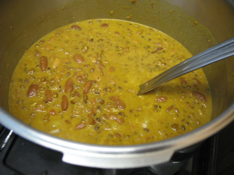 3. Cover tightly and bring to pressure (if using pressure cooker–if not, simmer covered until beans and dal are cooked). Reduce heat and simmer for 25-30 minutes.