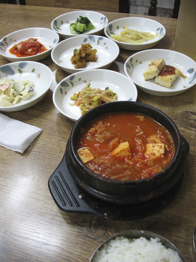 The above was a cheap, hot, and fulfilling meal.  The tofu was a little tough, the meat in the soup was gamey, and the cucumber kimchi (center banchan) tasted a bit like yak butter.  Good though.