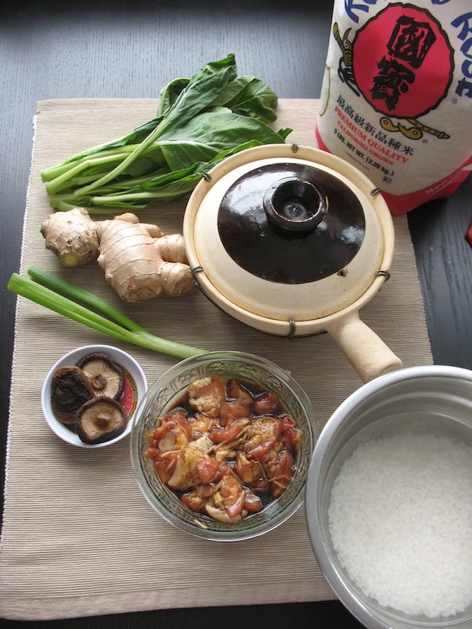 ingredients for my baozai fan, some fully prepped. Chicken with bone in chopped into chunks, marinated in soy sauce, rice wine, sesame oil, ginger, sugar. Dried shitake mushrooms were soaked in boiled water for 1/2 hr. Rice has been rinsed and soaking for 1/2 hour. Mushroom will be sliced and added to the marinade before cooking and green veg will be cut in half and boiled for 5 minutes in a separate pot