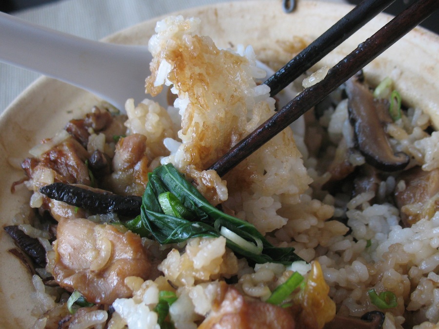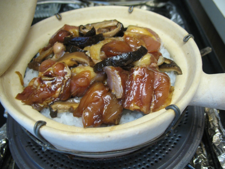 Most shops have a variety of marinated toppings (usually meat or fish) that will go into the clay pot once the rice has set, about 10 minutes or less into cooking. The marinade liquids will also help to give nice flavor to the crust on the bottom of the pot. Classic versions of the clay pot dish include chopped chicken (with bone-in) with mushrooms, sausage and smoked meats, marinated meat and egg.