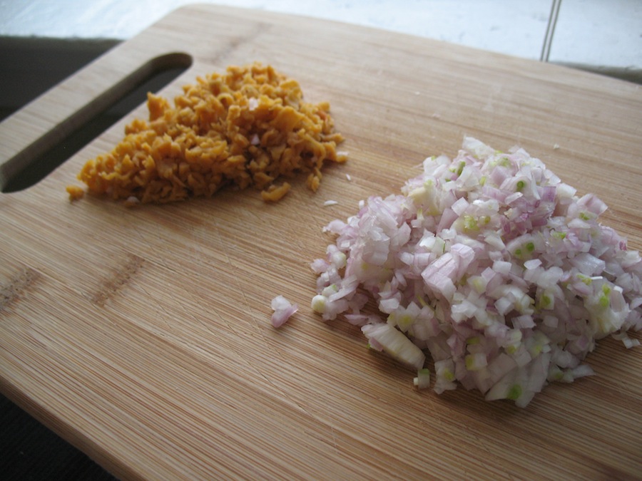 In a large wok (big enough to hold all the ingredients), start by frying the preserved daikon in oil: