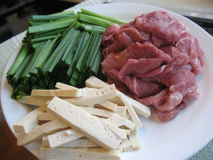 make large matchsticks of other stir fry ingredients: garlic chive leaves (jiucai 韭菜), firm tofu, meat. Shrimp is also a popular star of this dish, but today it is sliced pork for us.