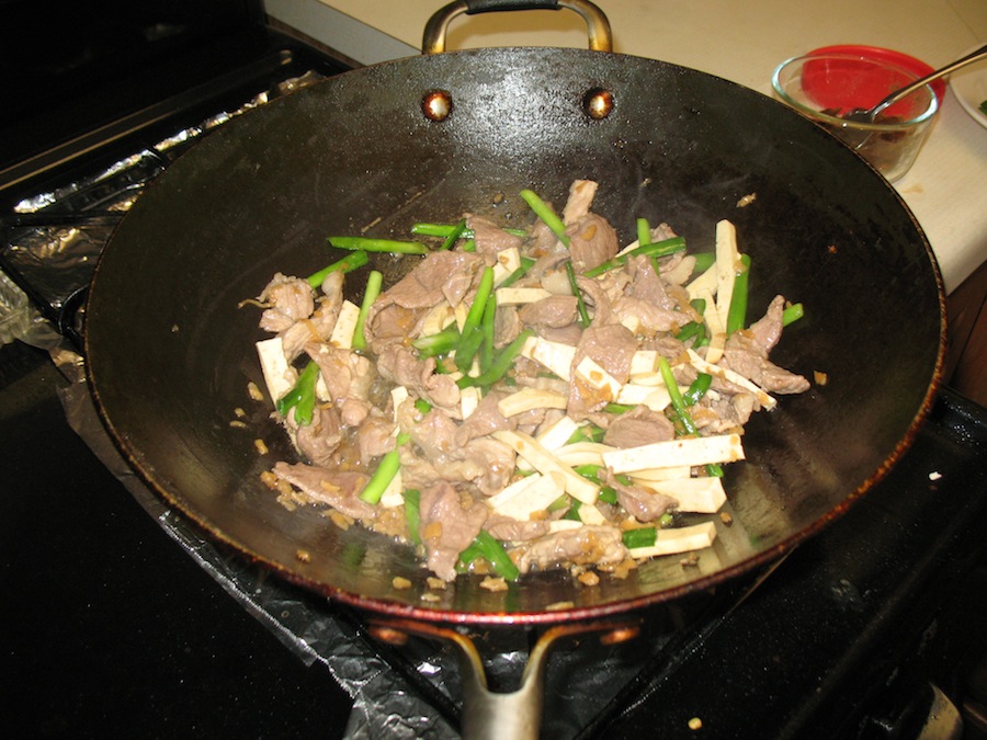 Add in the pork, tofu, and garlic chives. Fry until meat is just about cooked: