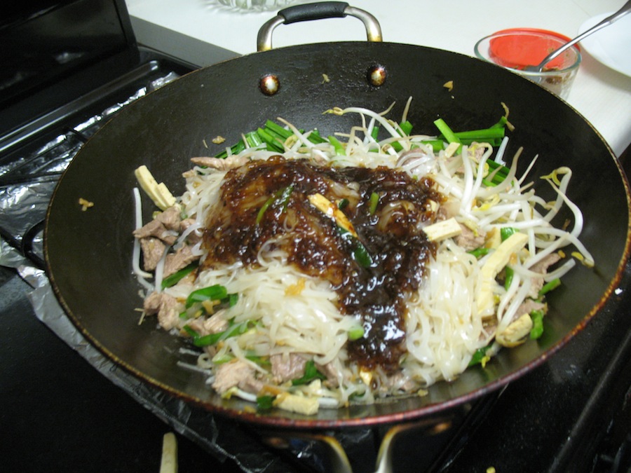 Add in the soaked an drained noodles, and a handful of mung bean sprouts: