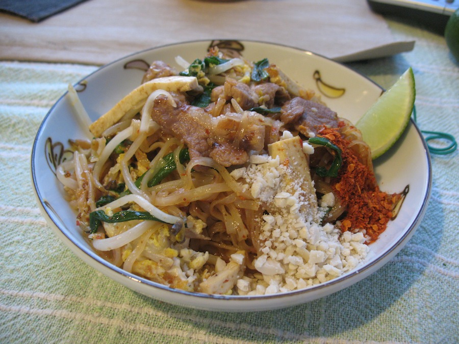 Pad Thai (ผัดไทย literally “Thai-style fry”) is one of the most popular and best known dishes in the genre of Thai cooking, both in Thailand and abroad. The name of this dish comes from a time of nation-building for Thailand, as an ethnic identity of “Thai” was heavily promoted in comparison with other peoples of the region (i.e. Thailand’s, or then Siam’s, large overseas Chinese community). To be sure, pad thai–as well as any other noodle dish–is built from a Southern Chinese foundation with its rice noodles, preserved daikon, garlic chives, and tofu. That said, it finally became the hybrid that we know and love, when that Chinese base collided with locally preferred local Southeast Asian flavors of tamarind, palm sugar, fish sauce, and hot chile.