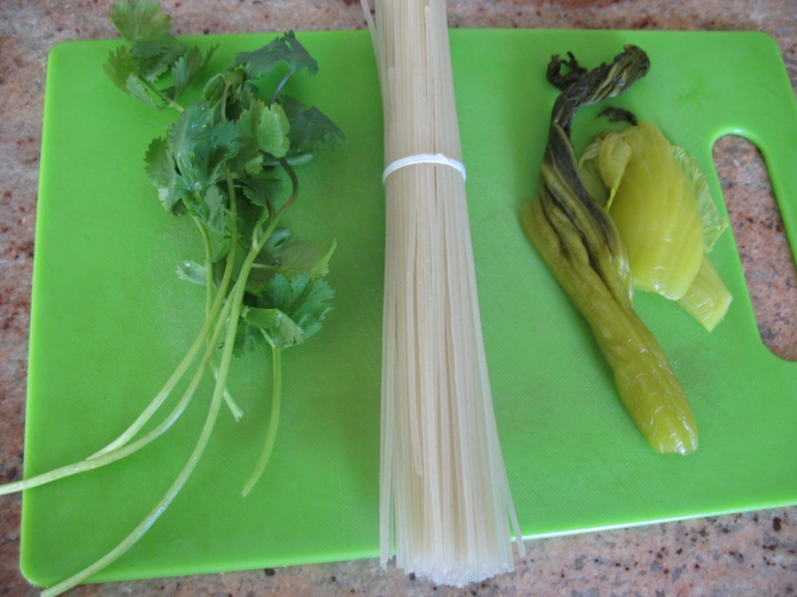 Ingredients for this bowl of noodles: cilantro, 1 bunch of spaghetti-sized mifen, and some pickled mustard green