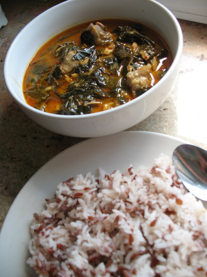 Kassod tree leaves and a leafy Thai curry with grilled fish (gaeng khiilek)