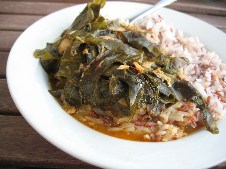 Kassod tree leaves and a leafy Thai curry with grilled fish (gaeng khiilek)
