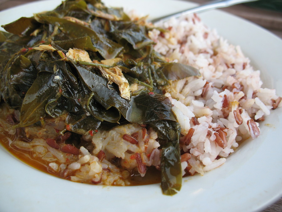 Kassod tree leaves and a leafy Thai curry with grilled fish (gaeng khiilek)