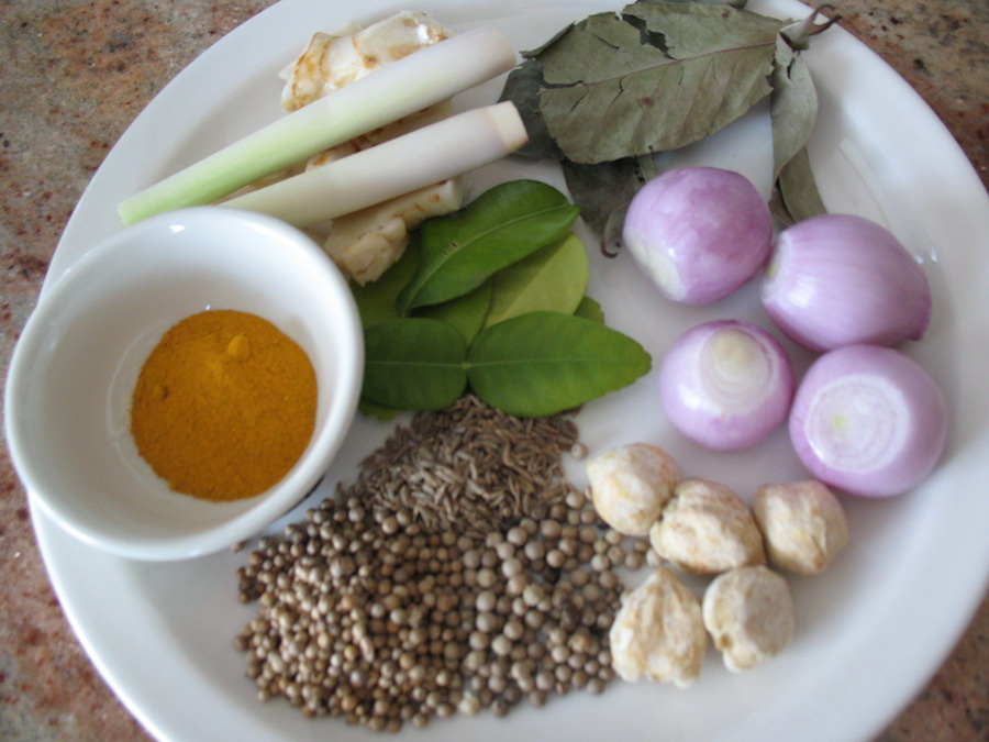 Prepare all other aromatics for soup. Clockwise from tumeric in the bowl, coriander seeds (and just above that cumin seeds), white peppercorns, candlenuts (kerimi), shallots, salam leaves, sliced galangal and lemongrass and kaffir lime leaves in center