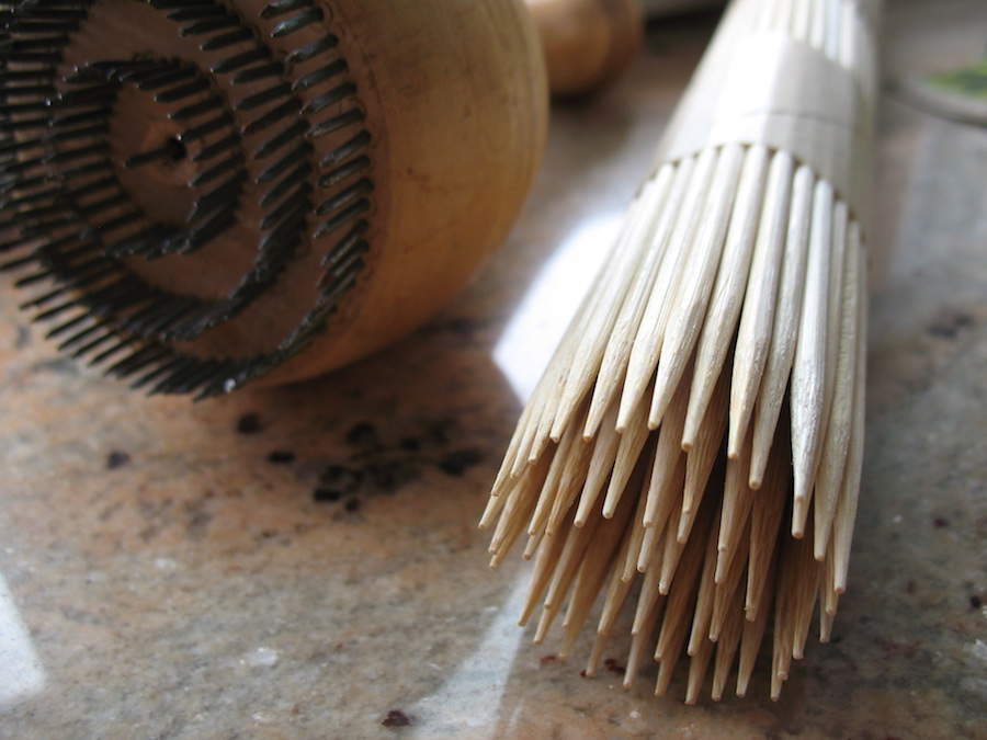 My finished bundle of skewers, spaced with layers of folded paper towels