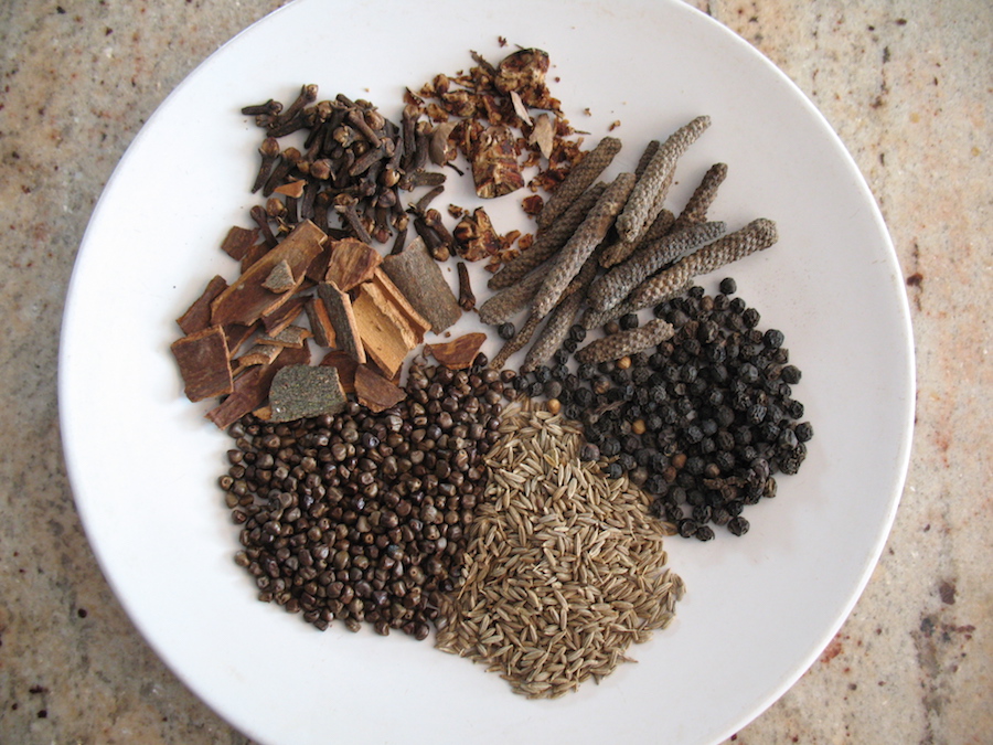 spices for mekelesha clockwise from bottom: cumin seed, korerima “false cardamom”, cassia bark, cloves, nutmeg, long pepper, black peppercorn
