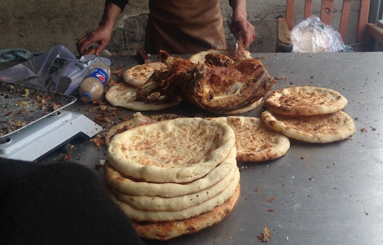 Prepping portions of “whole grilled lamb” on plates of nan in Hotan