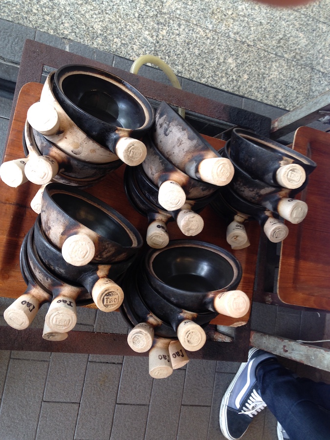 A stack of well-used 砂鍋 clay pots ready to go