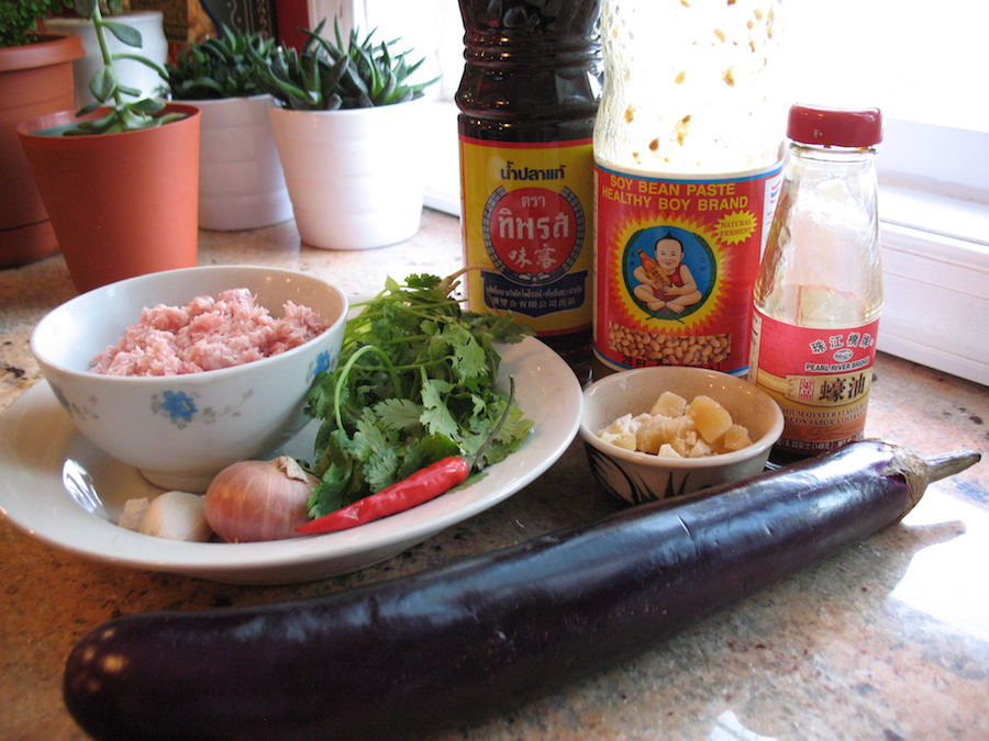 These are the ingredients I used for this. Clockwise from eggplant: Thai chile, shallot, garlic, cilantro, ground pork, fish sauce, soy bean paste, oyster sauce and palm sugar. I only used about 1/2 of that amount of palm sugar